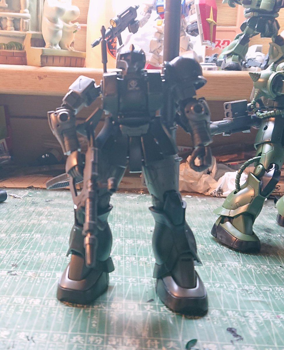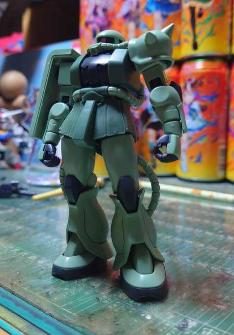 #ガンプラ #ガンプラの画像貼るとRTされると聞いて 最近出た、HG MS06ザクⅡを制作させて頂きました! 昔のに比べて、可動域も広がり全体的なフォルムも良くなっていて、技術の進歩を感じました( ´◡‿ゝ◡`) アニメ版を意識するため、スミ入れ等は行わず、そのまま組みました!