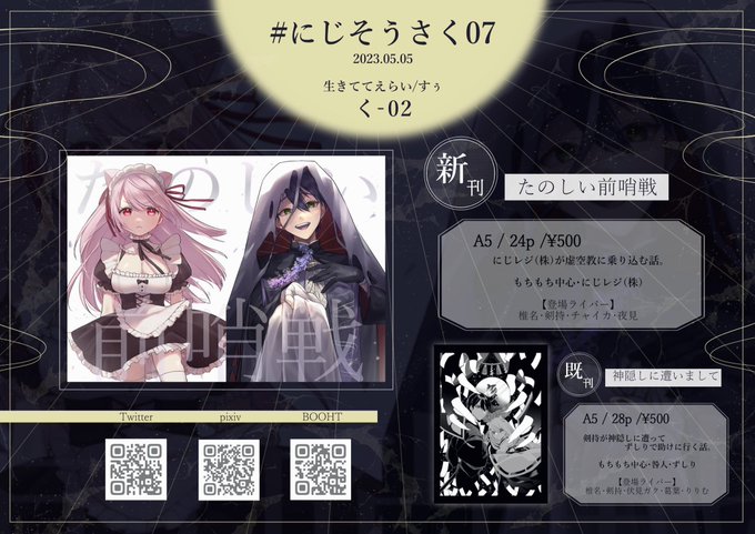 35 194 夜遅くにすみません! #にじそうさく07 のお品書きです!! 漫画です👻⚔もちもち中心! 既刊も少し持って行きます!! よろしくお願いします!!!!!! 23/05/02 03:02