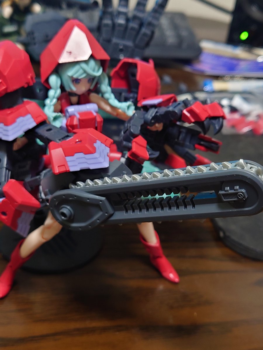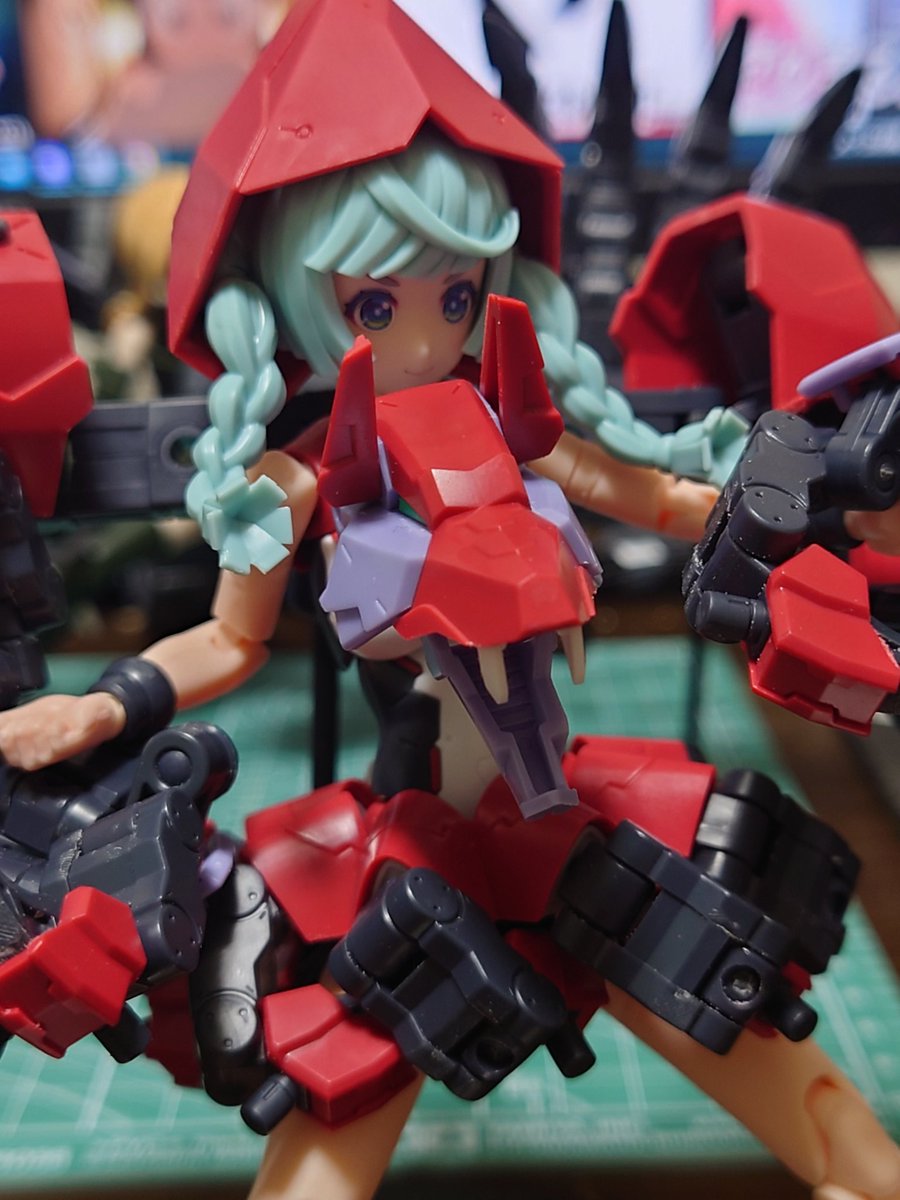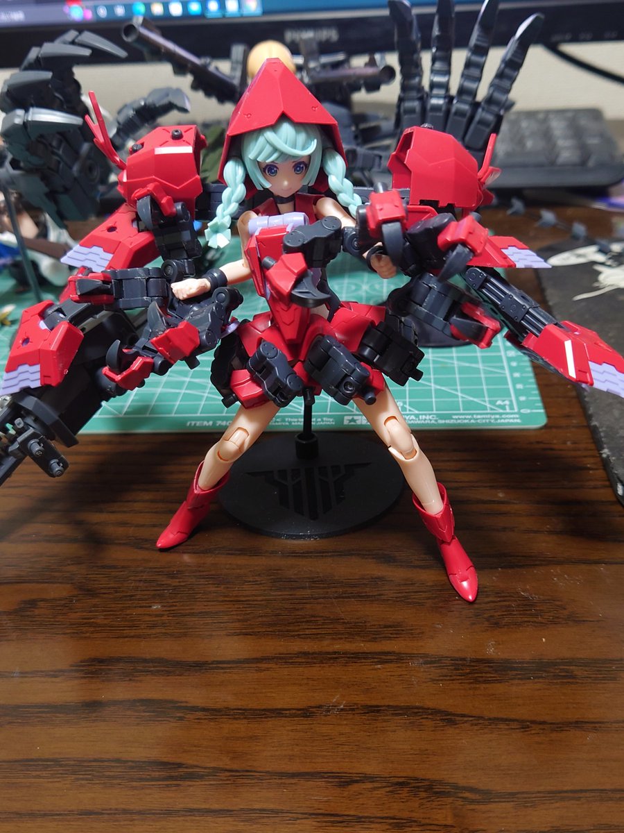 1 4 爪マシマシの赤ずきんType2 ウルフズヘッドを胸部装甲にしてケープ型触腕に様々な武器を搭載可能 #メガミデバイス 22/06/05 16:12