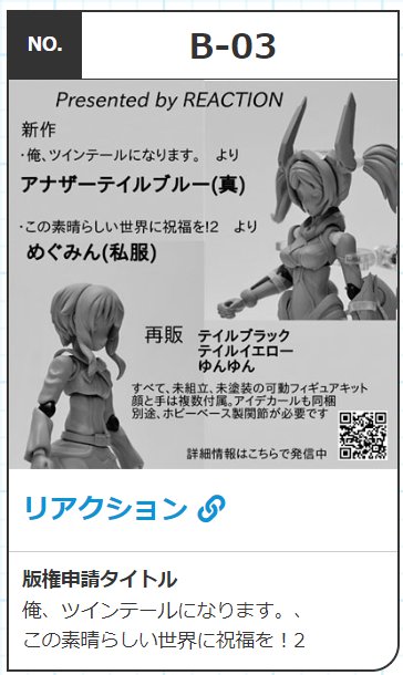ホビランの卓番はB-03とあいなりました。新作2種類と再販3種です。新作の現物を見ときたい人は、4月15日からのディーラーエキシビションでボークス秋葉原ホビー天国2の3Fに持っていくので見に来てね。 #ホビーラウンド28 #ホビラン28