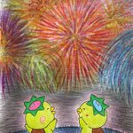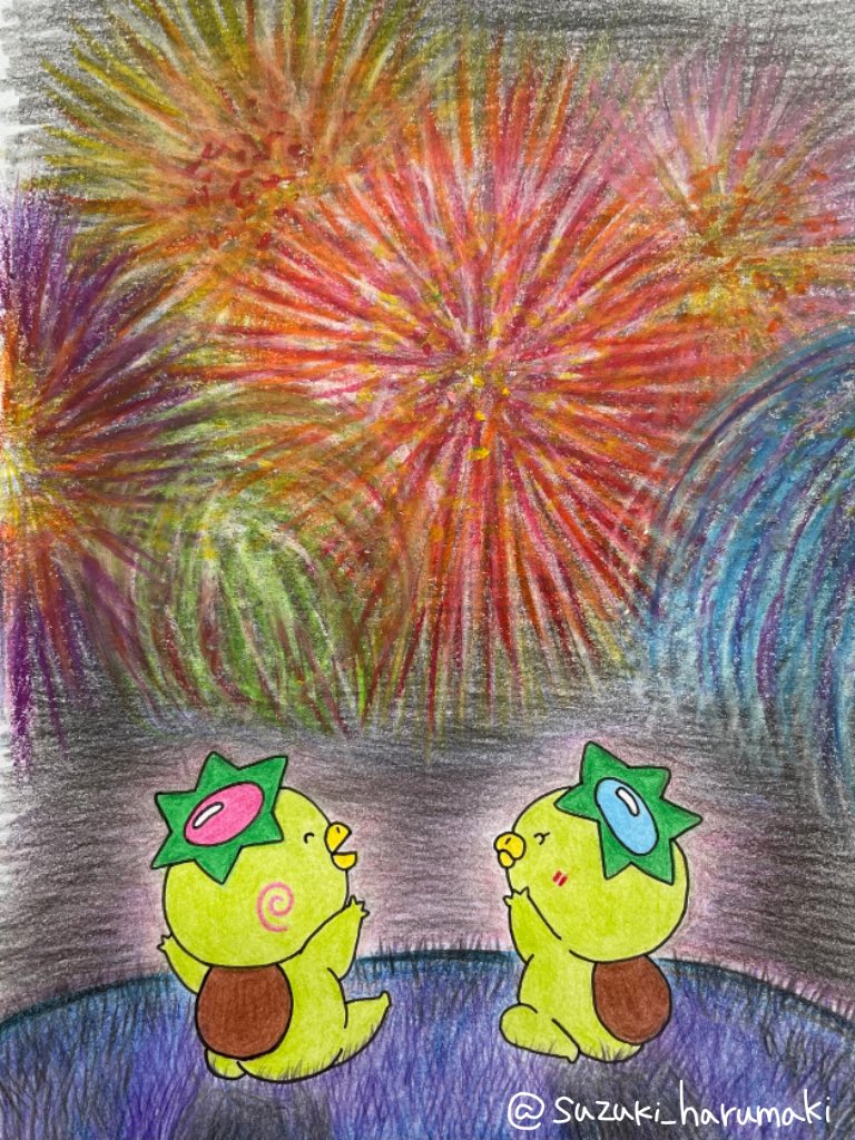 2 63 『ぱのすけ、夏の最後の思い出』 (๑ᴖΘᴖ๑)〈夏さん、また遊ぼうねー! #イラスト #ゆるいイラスト #ゆるキャラ #かっぱ #花火 #夏の終わり 22/08/31 08:17