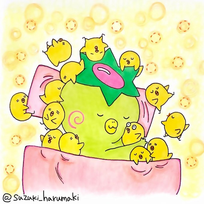 『肌寒い夜は…』 (๑uΘu๑) 〈ピヨたちと一緒にぬくぬく♪ポカポカいい気持ち…☆ #イラスト #ゆるいイラスト #ゆるキャラ #かっぱ #ひよこ