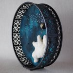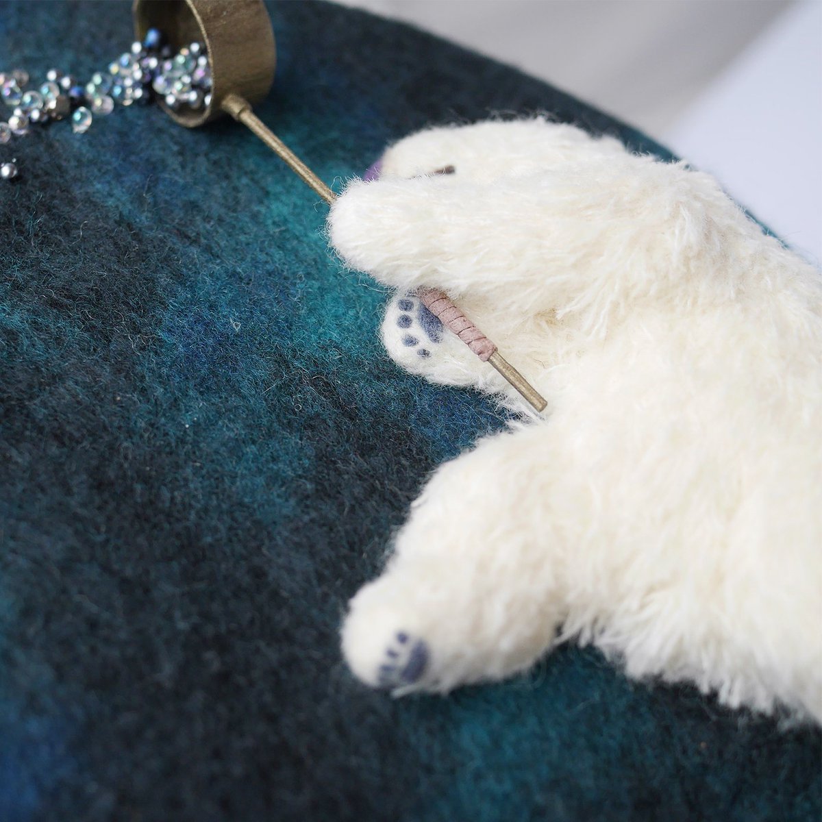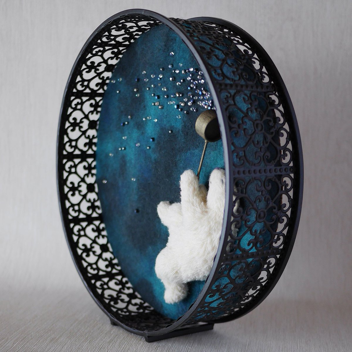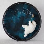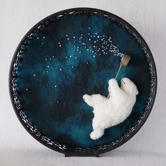 「ひしゃく星」 ひしゃくで星をまく白いくま。円形のフレームにはめ込んで、壁にかけても立てても飾れます。「小さな夜」で展示・販売しています。 hitujitoenogu.blog.fc2.com/blog-entry-108…