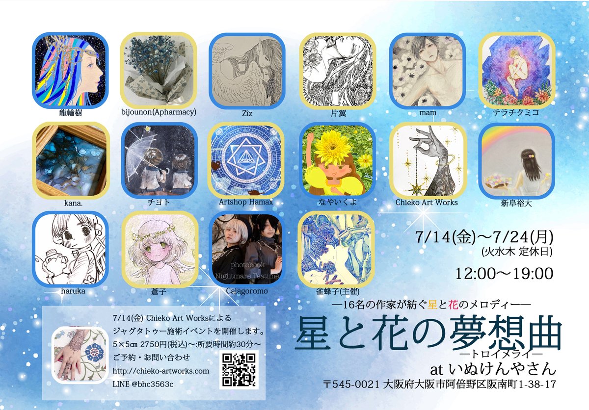 20 27 星と花をテーマにした展示会 『星と花の無想曲-トロイメライ-』 会期:7/14(金)〜7/24(月)(火・水・木曜日は定休日) 会場:いぬけんやさん (@inu_ken_) 〒545-0021 大阪府大阪市阿倍野区阪南町1丁目38−17 #拡散希望 #星と花の無想曲 #星花無想 23/07/13 21:07