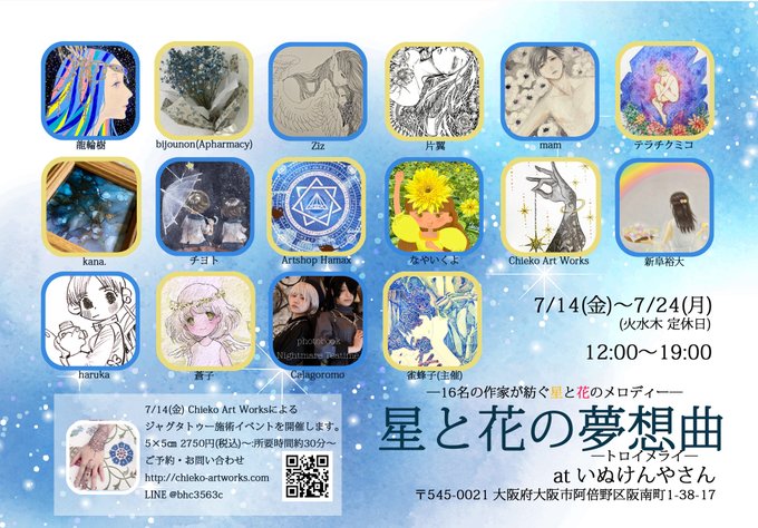 星と花をテーマにした展示会 『星と花の無想曲-トロイメライ-』 会期:7/14(金)〜7/24(月)(火・水・木曜日は定休日) 会場:いぬけんやさん (@inu_ken_) 〒545-0021 大阪府大阪市阿倍野区阪南町1丁目38−17 #拡散希望 #星と花の無想曲 #星花無想