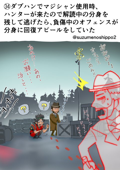 🌸第五人格体験談🌸 ㉞ダブハンでマジシャン使用時、ハンターが来たので解読中の分身を残して逃げたら、負傷中のオフェンスが分身に回復アピールをしていた 情報提供︰匿名希望さん