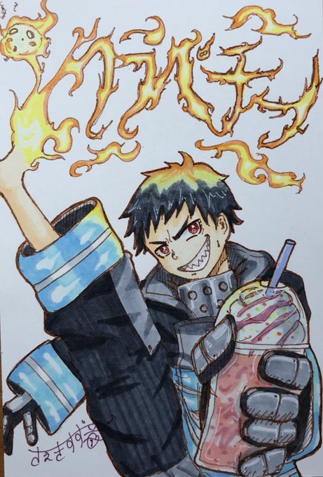 ぷすぷすが好きです! ストロベリーフラペチーノを飲んでいたら、いつのまにか、森羅くんに持たせてしまっていましたwww ついでに、頑張って炎で文字を書いてもらいました! #炎炎ノ消防隊 #森羅日下部 #しんらくさかべ #イラスト #コピック #イラスト好きな人と繋がりたい