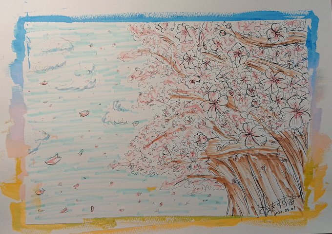 0 1 テーマ「私の好きな桜の風景」 #アクリル絵の具 #ペン画 #コピック #春 #エイフリルプールにお絵かき 22/04/01 19:00