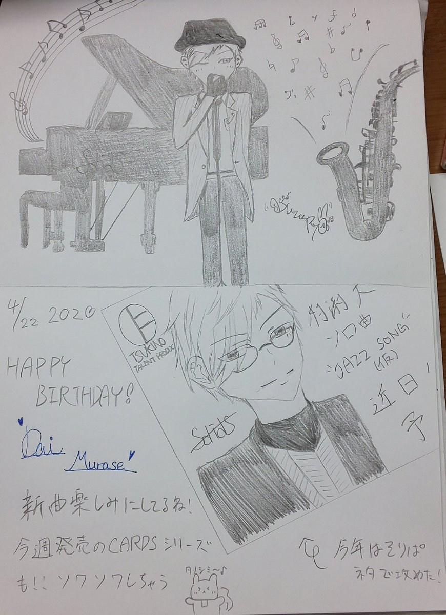 撮り方失敗しました斜めになってしまった(-_-) 大ちゃんお誕生日おめでとう*ˊᵕˋ*やっとオリ絵で参戦だよ!間に合ってよかった(笑)去年のそりぱで中の人がJAZZやりたいって言ってたからそれをイメージして描きました。絶対カッコイイ⋯お待ちしてます!大好き! #村瀬大誕生祭2020 #村瀬大生誕祭2020