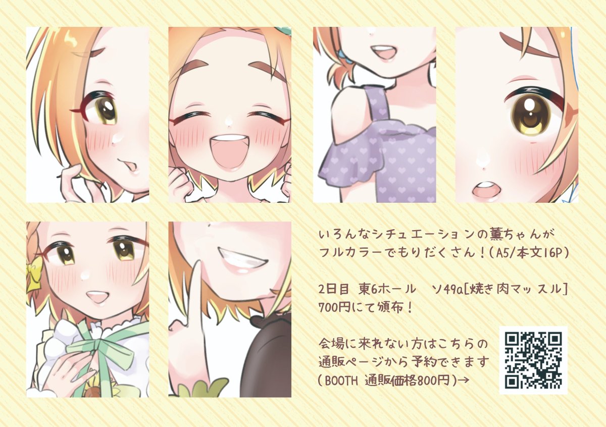 シンステ新刊サンプルです🌻 モバ薫ちゃんイラスト+漫画本です! フルカラー/A5/本文10P/ポストカード付/700円 シンステみ31にて頒布します🫶 今回の表紙は偏光仕様です!黄色味がかなり強いけどかわいい〜💓おまけのポストカードもキラキラです✨ 通販↓ suzushi1122.booth.pm/items/4606220 #cin_stage twitter.com/i/web/status/1…