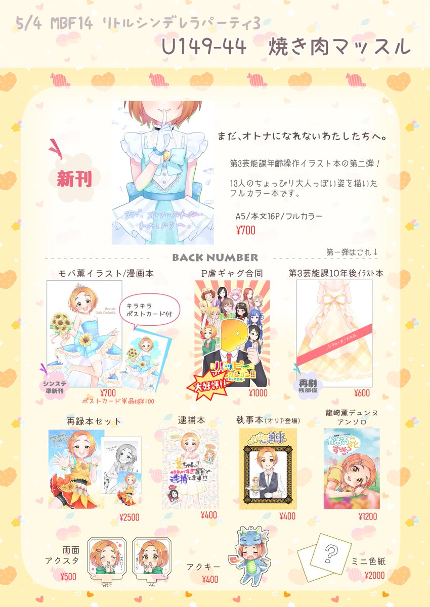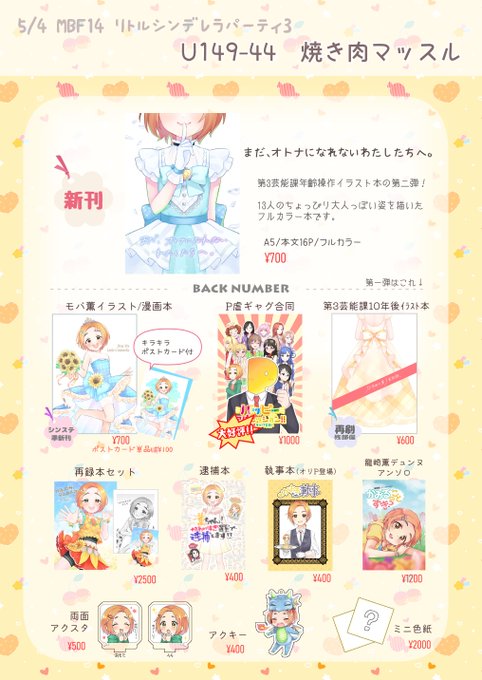 5/4MBFのお品書きです📝 新刊は第3芸能課年齢操作イラスト本第二弾🌻 去年のU149オンリーで頒布した年齢操作イラスト本第一弾も少しだけ再刷したので持っていきます✨ 追加で色紙いっぱい持っていけたらな~&無配ペーパー描けたらな~の気持ち、、💭 #MBF14 #U149オンリー twitter.com/suzushi1122/st…