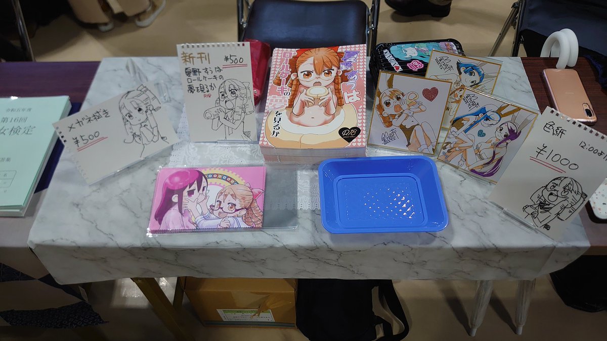設営完了。新刊とトークイベントで出したメガネ拭きと色紙用意して新潟コミティアA-12aでお待ちしてますー。