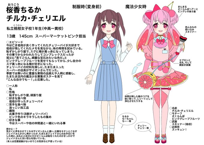 チルカちゃんの全身です🍒💕 さくらんぼは3つ、ピンクグレープフルーツ(モチーフ)は4つあります!探してみてね😊✨ #絵師が本気でボードゲームを作る企画 #イラスト twitter.com/MUGENProject_R…