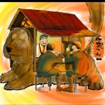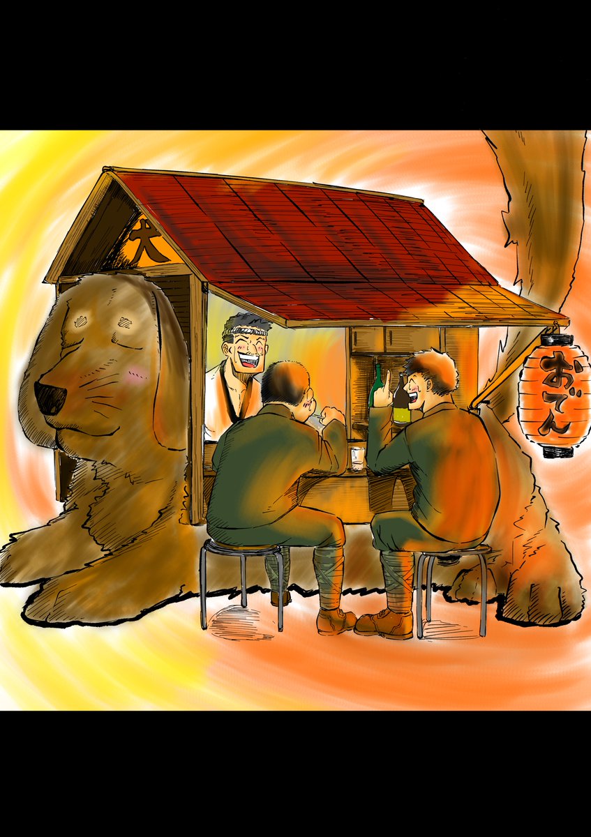 「屋台」 人もご飯も暖かい方が良い あの時、弟に出来なかった事を満足げにやってあげてるお兄ちゃんを描きました 屋台は犬小屋っぽくなって、、、ないかw でもこういう情景が好きなんですよね。 #イラスト #創作 #絵描きさんと繋がりたい