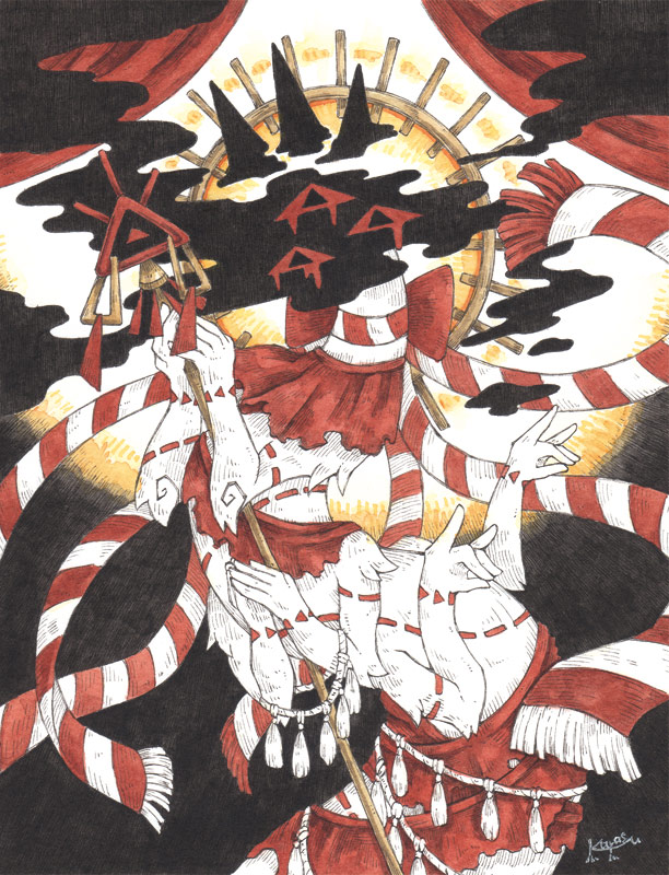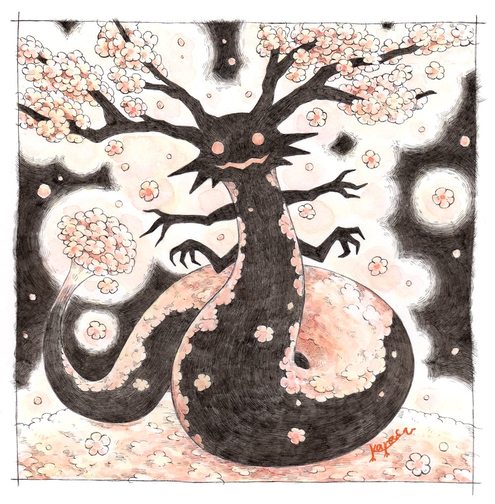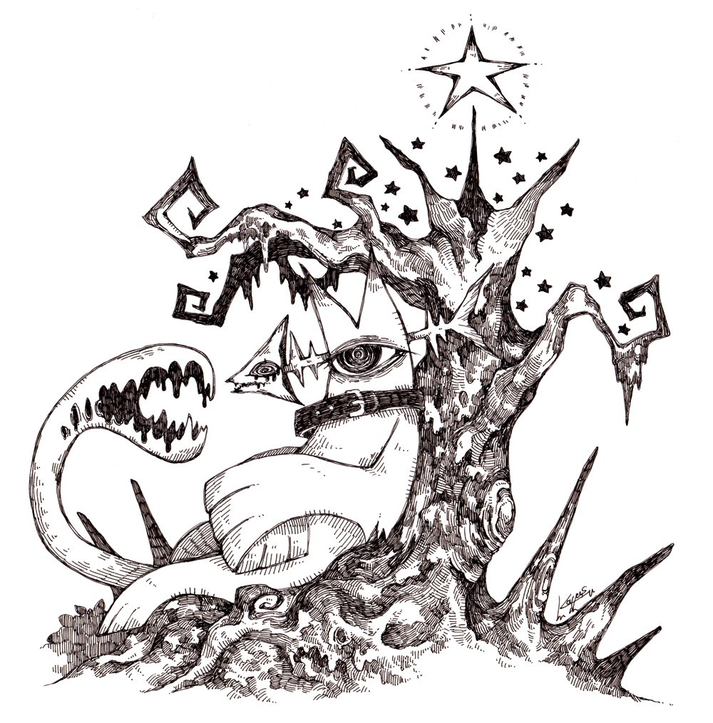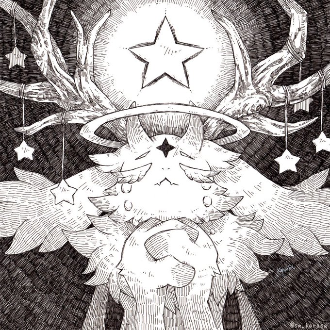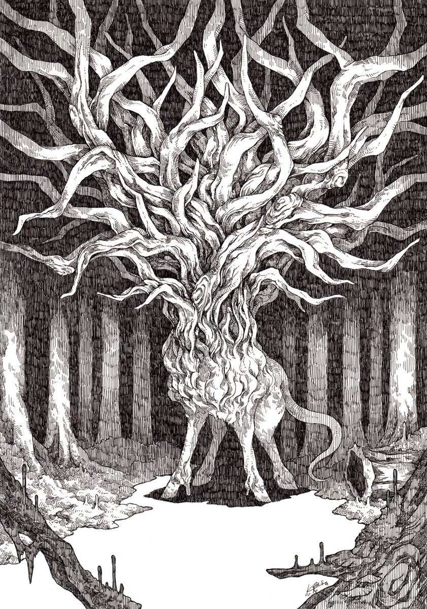 #アナログ絵師の本気を見せてみろ 細密ペン画が好きです。黒いところは何重にもタッチを重ねて表現しています。 絵を探していて気がついたんですけど、鹿的な生き物+枝分かれした木のようなデザイン、好きよね…