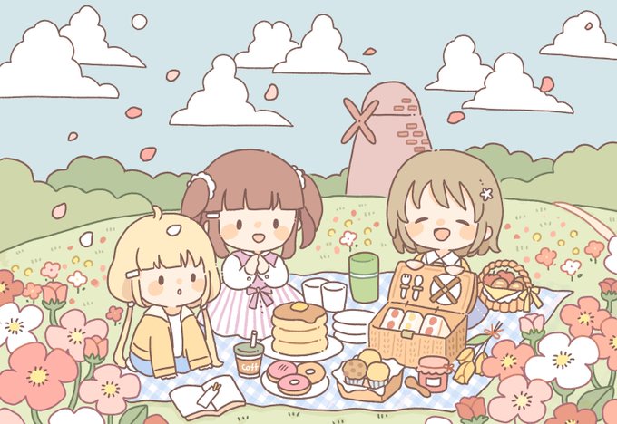 6/11 歌姫庭園35で頒布予定のピンキーキュート合同カレンダー 4月を担当しました!春のピクニックでお昼寝する3人を描いてます🌼 とっても豪華でかわいい1冊なのでぜひ〜! twitter.com/ponkotutta/sta…