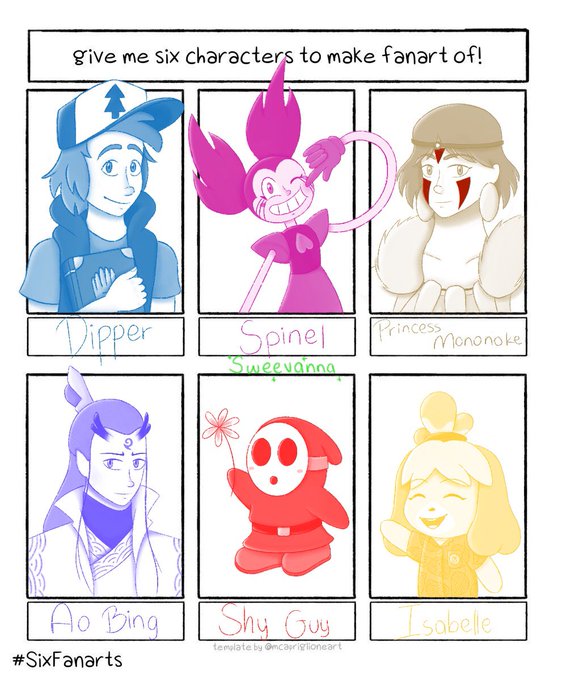 #SixFanarts ! Part 2 (of 2) Characters: Dipper Pines #GravityFalls Spinel #StevenUniverse Princess Mononoke #StudioGhibli Ao Bing #Nezha Shy Guy #SuperMario Isabelle #AnimalCrossingNewHorizions