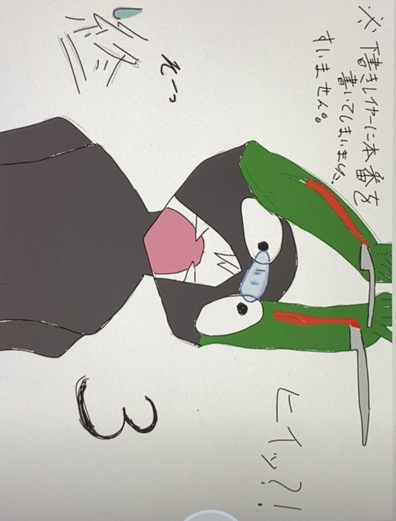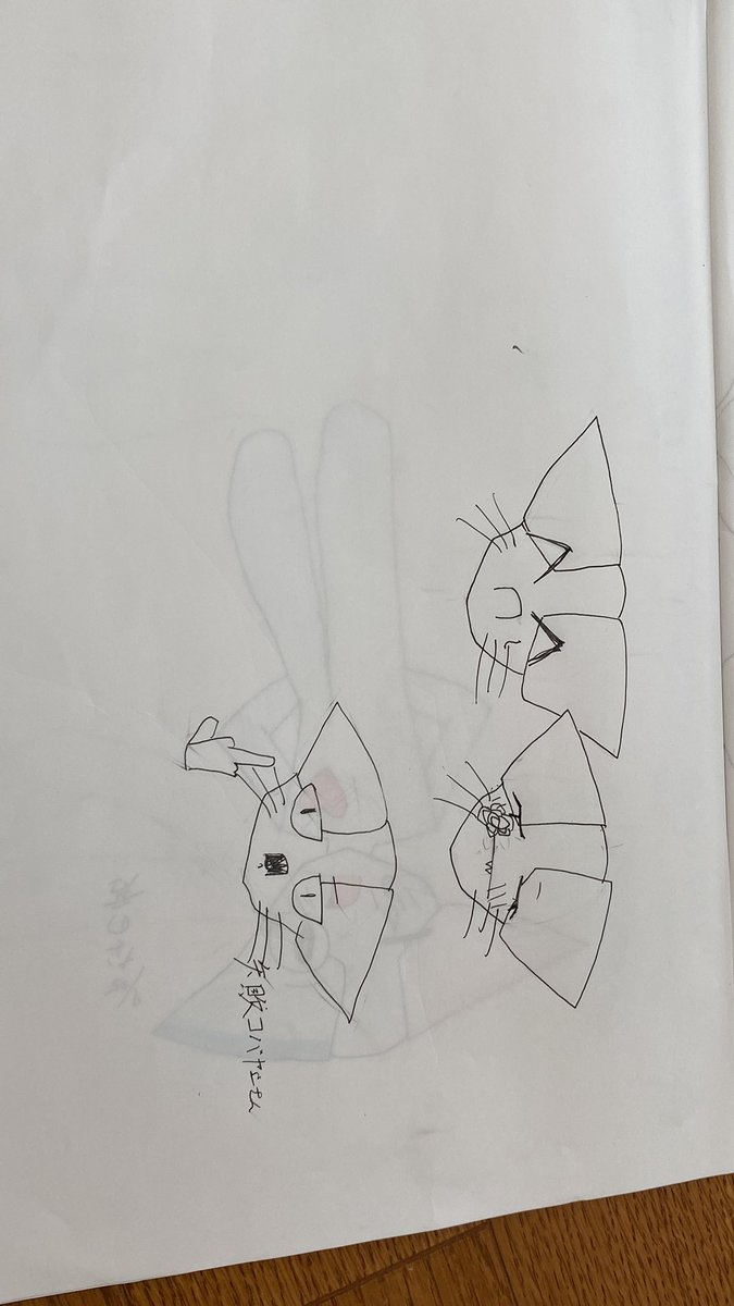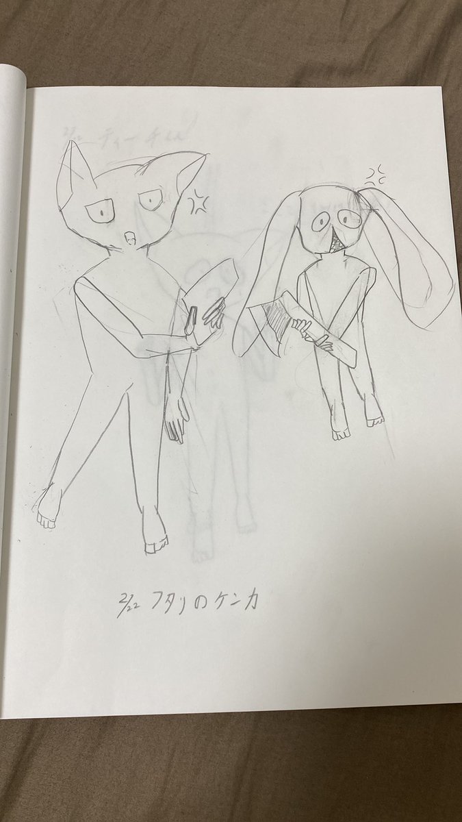 #ねこのティーチくん サムくんとコバヤシさんが喧嘩しているのを描きました。色が塗られていないのとサムくんが下手になってすいません