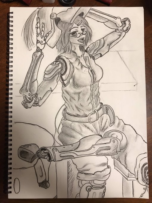 半年前に描いたハガレン仕様のロボ子さんペン入れ。 (ペン入れしてるのはどっちでしょう) #ロボ子Art #ロボ子さん