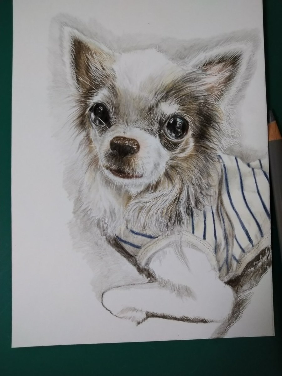 #絵描きさんと繋がりたい #色鉛筆画 #犬画 チワワちゃん、優しい猫さんの飼い主さんに絵をお渡ししてとても喜んでいただきました。勉強中の私にはエナジードリンクよりも栄養になります。また始まり!