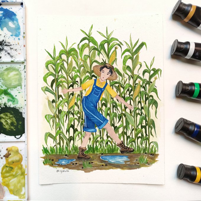 Mari menanam jagung dikebun kita 🌽🌽 Inspired by harvest moon 🤣 #art #gouache #zonakarya #ArtistOnTwitter