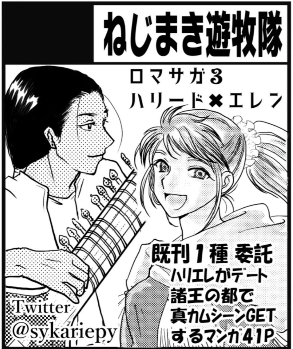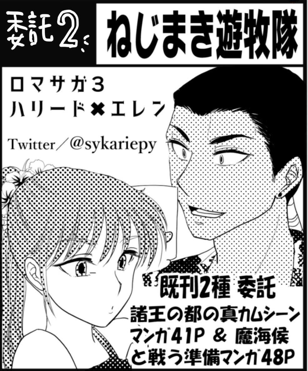 31 54 #サガエアフェス4 スペース【雪・え6】ねじまき遊牧隊で参加します! サークルカット、お品書き、参加シートです! 旅するハリード×エレンがコンセプト! 新刊は魔海候編(前)で、術士を集めるところまでがマンガになっています。既刊もあります。元気があれば、当日までに何か出したいです~! 22/05/13 16:42