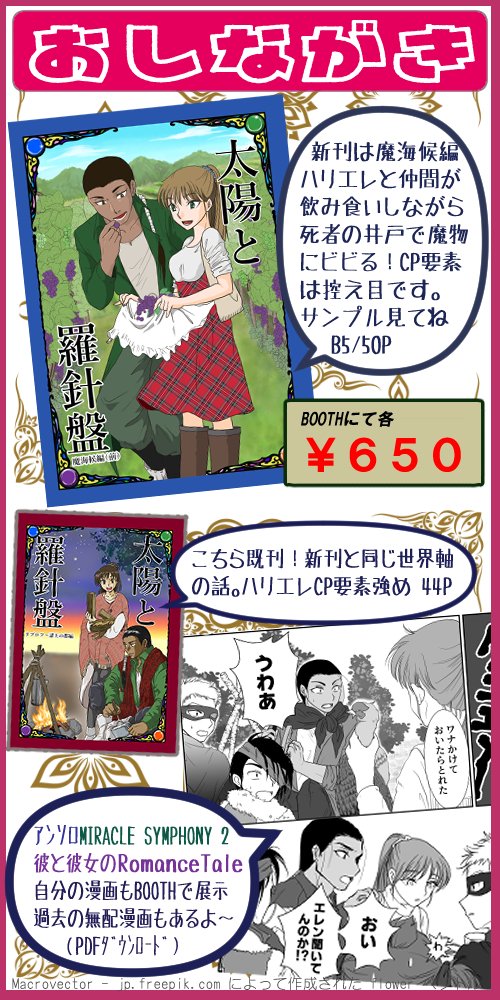 25 35 #サガオル4 のサークルカット、お品書きです。 委託2で、参加します!既刊2種です。よろしくお願いします〜! 当日は、Twitterにおまけペーパー(オチのないまんが)をUPします。 22/11/01 00:21