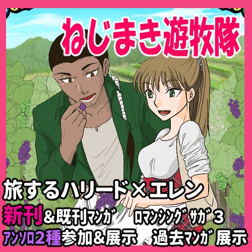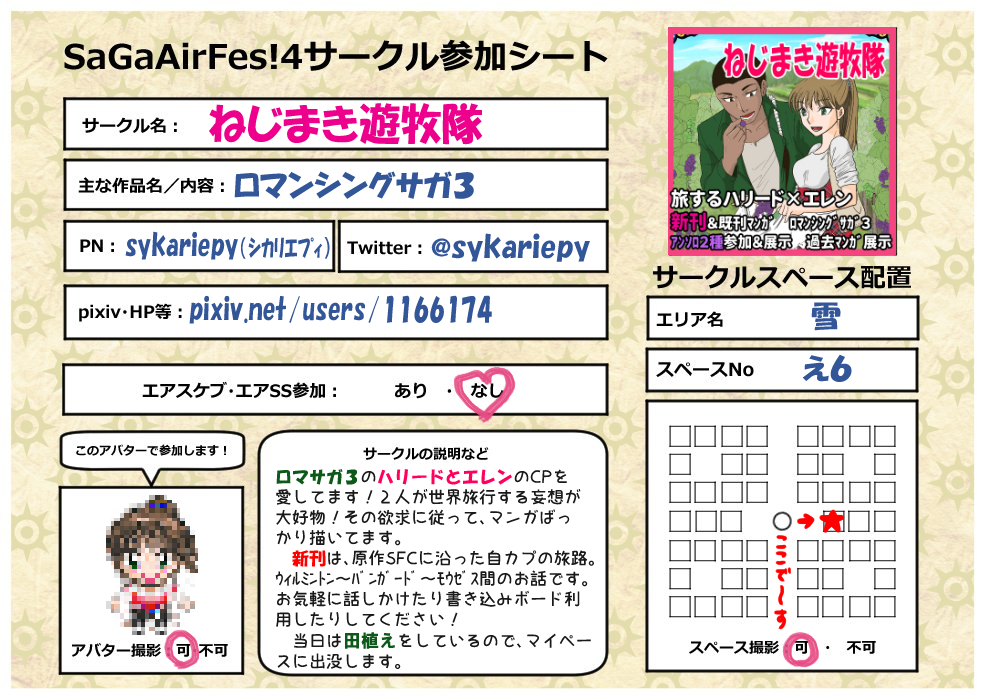 #サガエアフェス4 スペース【雪・え6】ねじまき遊牧隊で参加します! サークルカット、お品書き、参加シートです! 旅するハリード×エレンがコンセプト! 新刊は魔海候編(前)で、術士を集めるところまでがマンガになっています。既刊もあります。元気があれば、当日までに何か出したいです~!