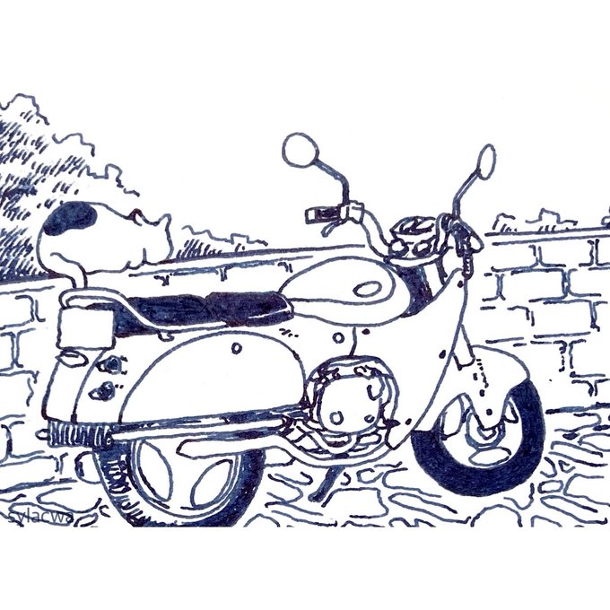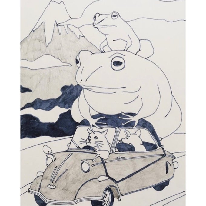 タイトルに二〇二三をつけたのはむかし「ぶじかえる」画を描いていたから。クルマとカエルなら、と似た構図で描きましたぽん🚗🐸 #inkdrawing #ペン画 #絵 #イラスト twitter.com/sylacwa/status…