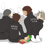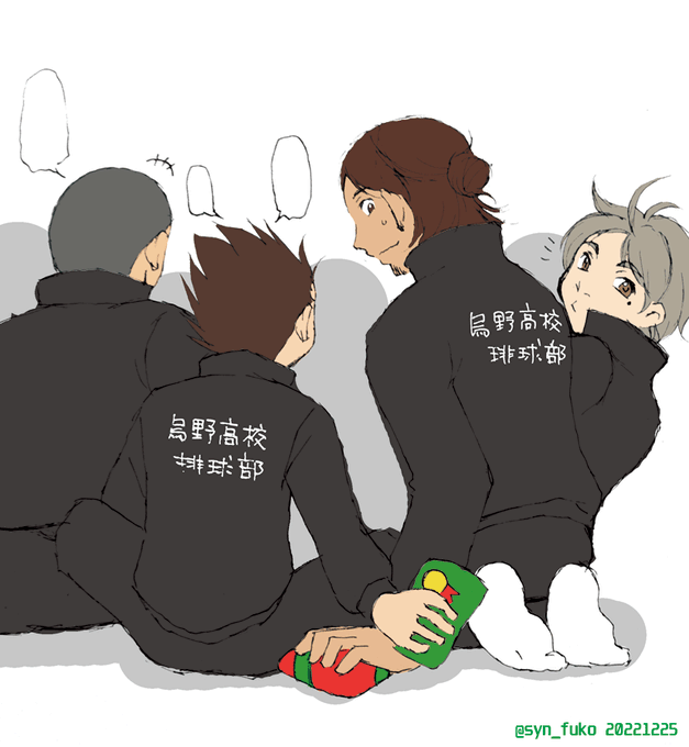#東西ゆるワンドロワンライ お題「聖夜」 部のクリスマスプレゼント交換会の中、こっそり背後でお互いのプレゼント交換とかしてて欲しい。 旭さんはこういうの下手そうなので多分スガさんあたりにバレる。