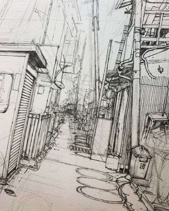 0 7 ペンの描き込みが止まらない…💦 色黒もアリだけど、いちおう色は塗る予定😅 今日はこの辺で… #shihonoe #ペン画 #アナログイラスト #illustration #電柱のある風景 #暗渠 23/04/23 21:53