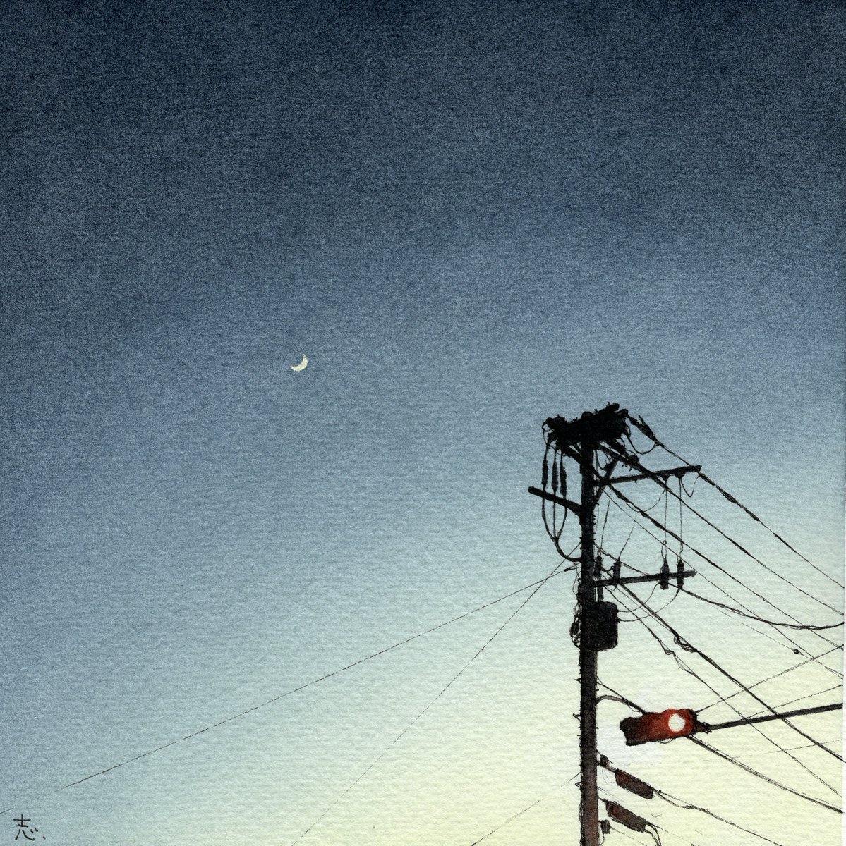 電柱電線と最後に星をちょんっと入れて完成🌟 #shihonoe #イラスト #アナログイラスト #水彩画 #ペン画 #電柱と空