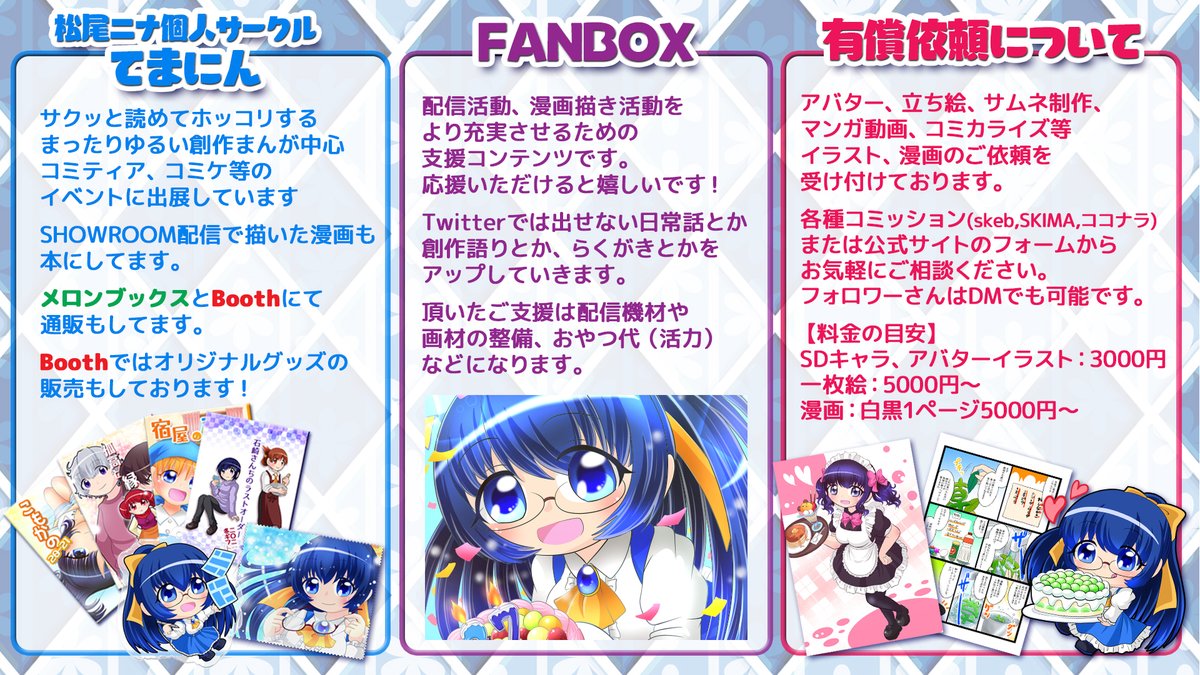 🫐配信 Youtube youtube.com/c/NinaMatsuo27… SHOWROOM showroom-live.com/7f5ff3621973 FANBOX syobi27.fanbox.cc 🫐絵のご依頼 Skeb skeb.jp/@syobi27 SKIMA skima.jp/profile?id=130… ココナラ coconala.com/users/1905660 🫐通販 Booth 27temanin.booth.pm メロブ melonbooks.co.jp/circle/index.p…