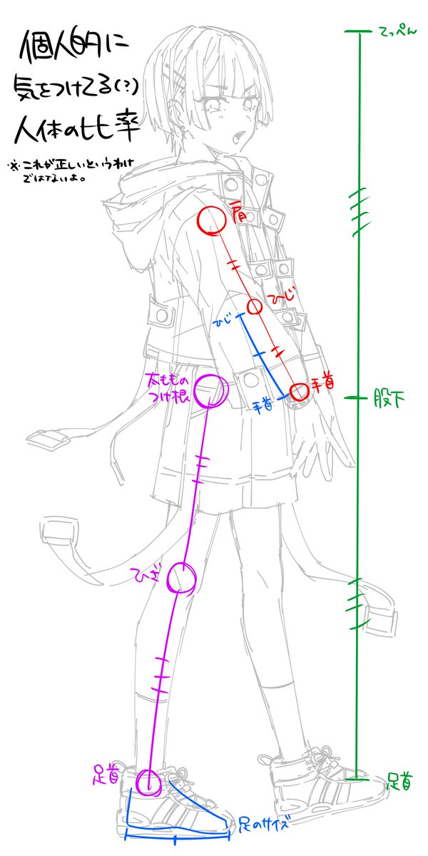 僕の描く人間のバランスがとても良いとお褒めいただくので、個人的に気をつけているところをざっくり描いた 人間のパーツって案外どっかこっか同じ長さだったりするんだよ〜(人にもよる)