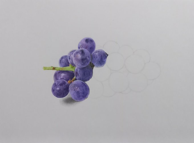 絵を描くと急に上げ始めるw でもこの数年で600人くらいフォロワーさん減っちゃったからなぁ😂 葡萄、1日2粒ずつくらいかな? 1粒で1時間かかってたwww #色鉛筆 #色鉛筆イラスト #デッサン #葡萄 #静物画