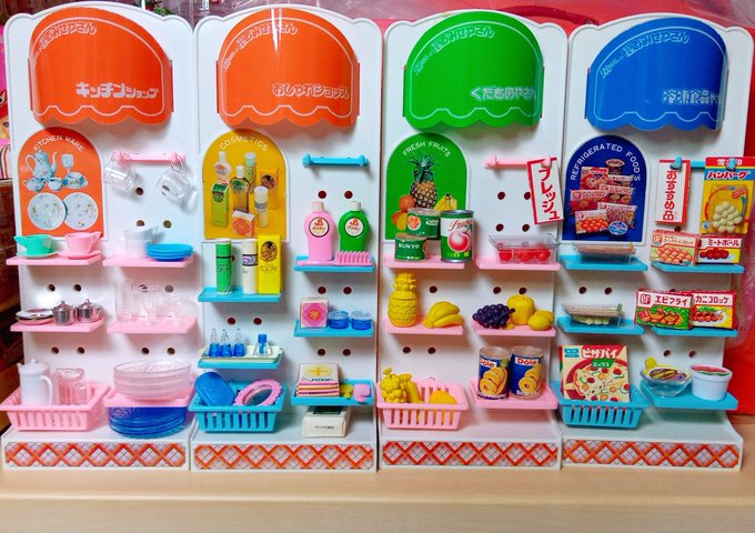 小さなお店4つ揃ったのでお部屋の片隅に並べて楽しんでましたが、ホコリが付きそうなのでそろそろお片付け。 箱にしまうと次に出すのはいつになることやら… おもちゃ用の大きなガラスケースが欲しいです〜😂