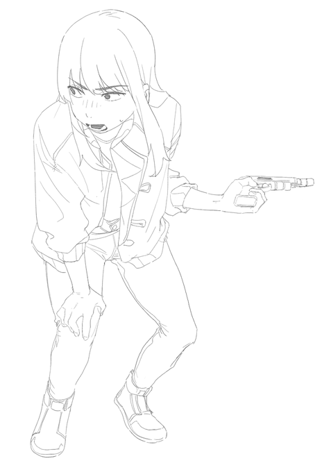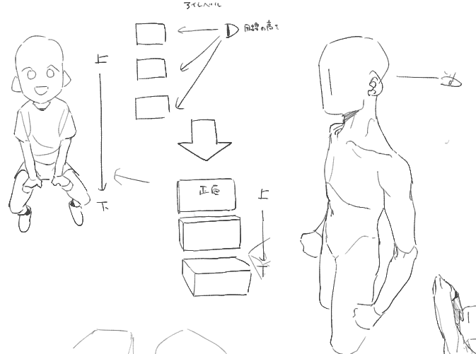 つまり私が絵を描いている時の意識はこういう事ですね… 角度のついた構図の書き方については一枚目で説明しているし、「線をとりあえず置かないと全体が見えない」は二枚目で説明している。