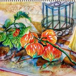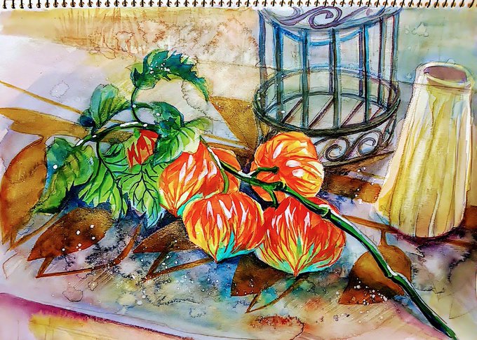鬼灯(ほおずき) F4号 ヴィフアールスケッチブック ホルベイン水彩 アクリル絵の具一部 メタリック顔彩一部 秋が来たよね。 植物は秋と既に知っている。 #透明水彩 #水彩画 #絵描きさんと繫がりたい