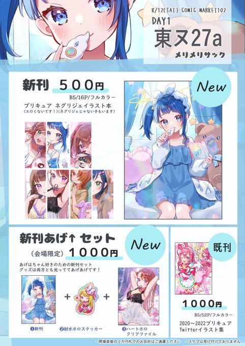 あなたのサークル「メリメリサック」は、コミックマーケット102で「土曜日 東地区 “ヌ” ブロック 27a」に配置されました !webcatalog.circle.ms/Circle/Map/173… #C102WebCatalog こんな感じのプリキュアたちの本が出ます!よろしくお願いします~!