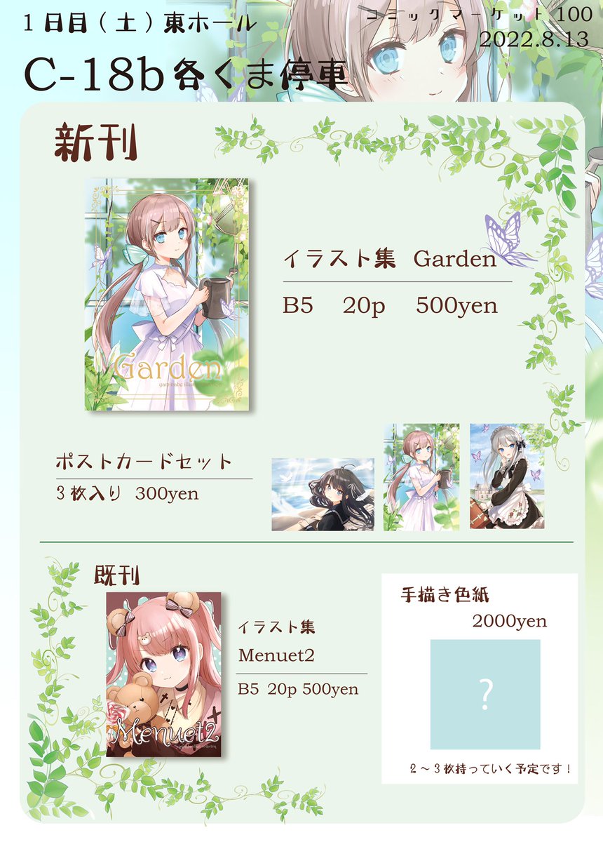コミケのお品書きです! 1日目(土)東ホールC-18bでお待ちしております! 宜しくお願いします🍀 #C100 #C100お品書き