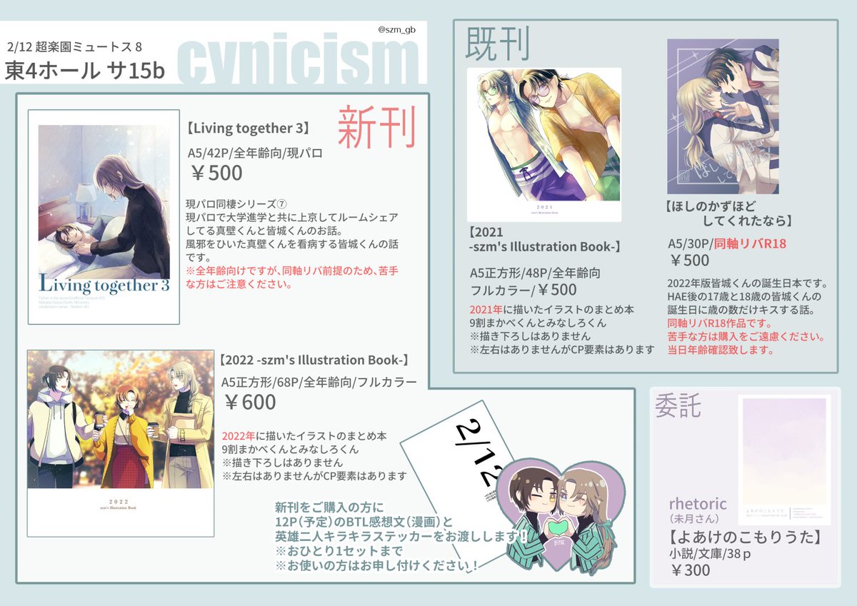 【お知らせ】 2/12のおしながきです~! 新刊既刊委託諸々あります。 当日は東4ホール サ15b におります。 よろしくお願いいたします! pixiv→ pixiv.net/artworks/10511…