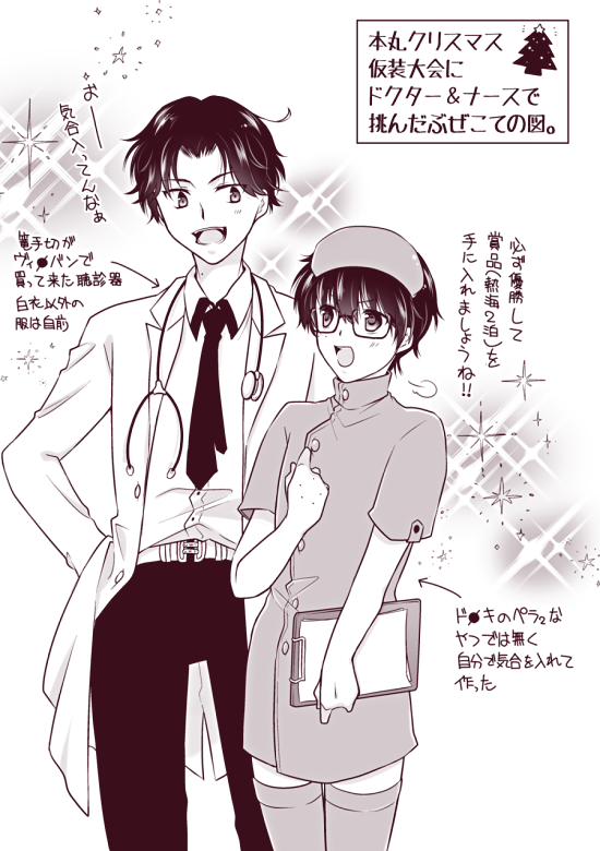 遅刻な上にクリスマスと全く関係の無い医者×ナースコスプレのぶぜこてを描きたかったので描きました(※クリスマス含有率3ミリ)※女装注意 前回に引き続き遅刻でスミマセン……!! #ぶぜこての日は毎月25日