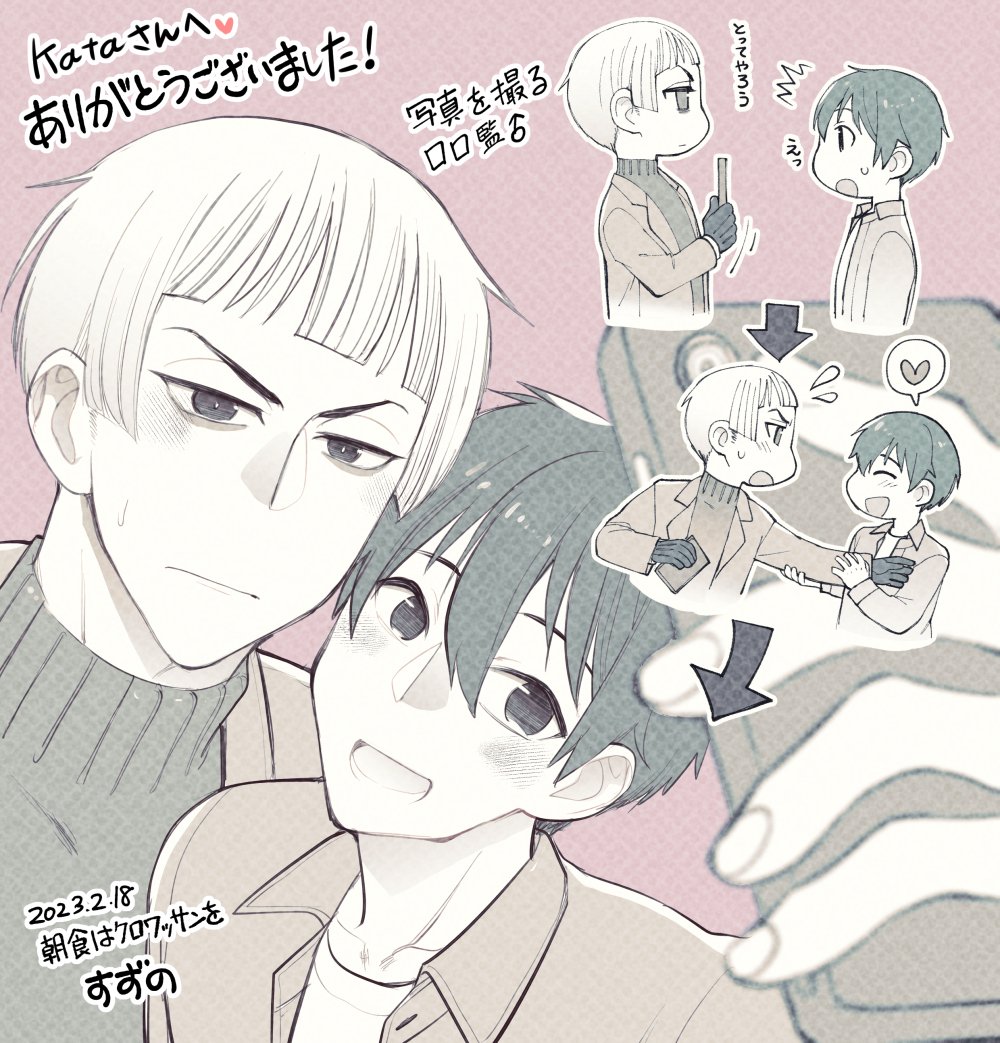 2 11 遅くなってすみません!2/18の□□監♂オンリーでのエアスケブになりますー!リクエストありがとうございました🥰 🦐「写真を(一緒に)撮りましょう!」 🔔「ああ、私が撮影しよう」 🦐「えっ(違…)」 からの流れになります! 監くんをデジカメで初撮影する□くんにするか悩みましたがこちらで! 23/03/02 14:27