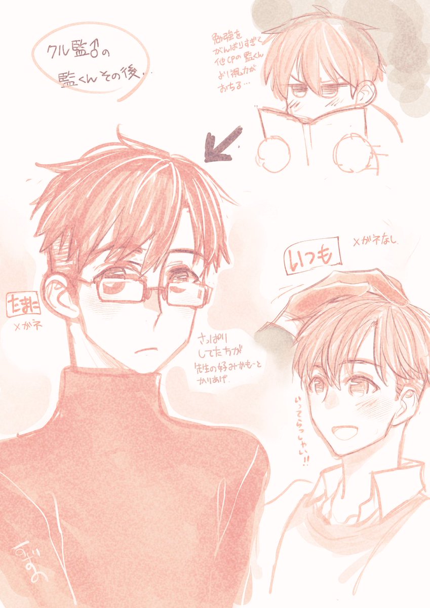 0 10 これは昨夜描いてた監くんらくがき。本当に未だに安定しなくて過去のまとめをたまに見てはダメージを受けてます。 前髪の真ん中がまとまってるのと、耳の上がハネてるのが目印! 23/03/15 08:13