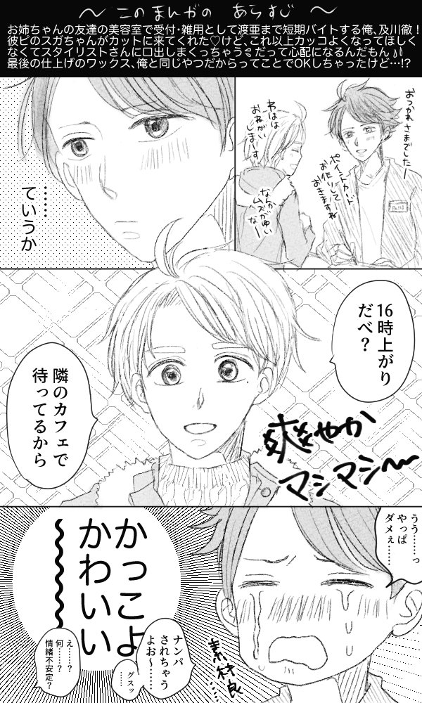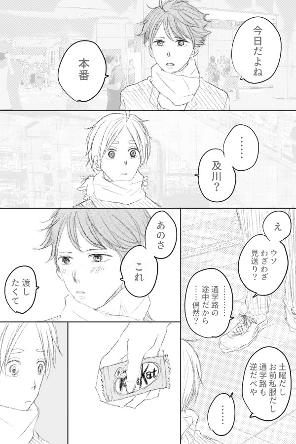 ににさんの「試験会場で休憩時間に及川からもらったキッ🍫カット食べる菅原くん」というツイが良すぎて漫画を描かせていただきました。 引リツしてるバレ🍫タイン漫画の続きの世界で、渡亜の負い目で告白できない及川×この想いに名前をつけられないままここまで来た菅原の及菅です。 ①(1〜4P/13P) twitter.com/t0nn0nn1_07/st…