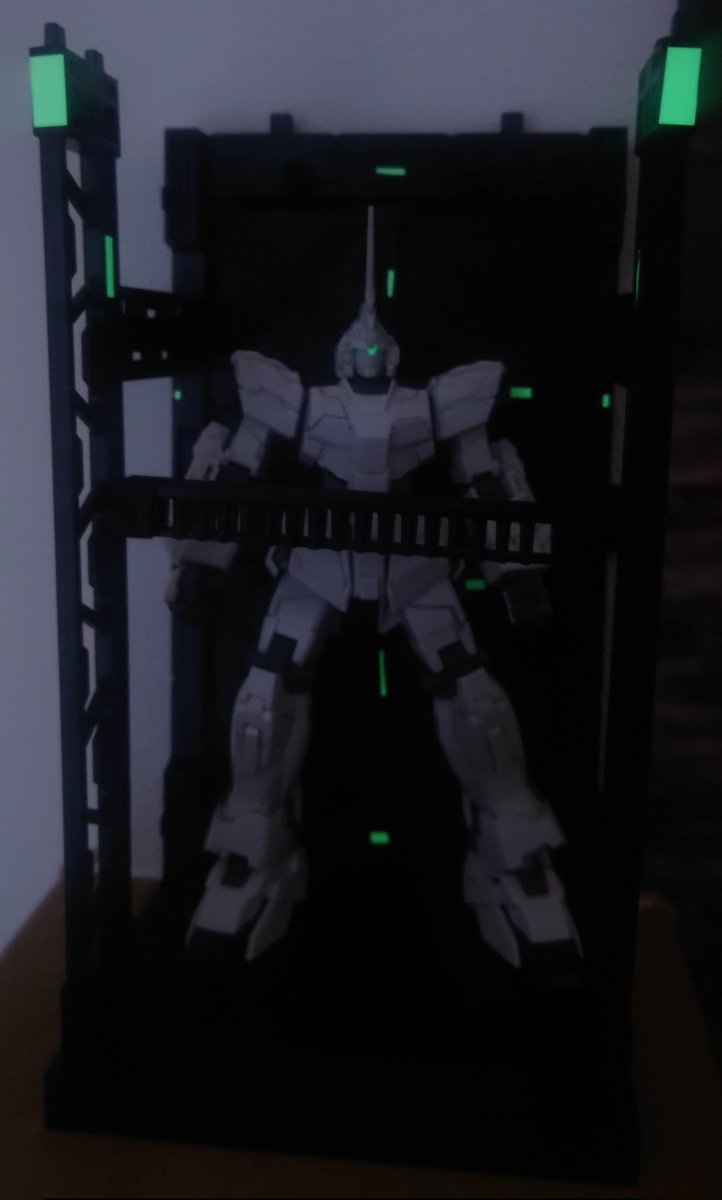 最近蓄光テープ厨と化している某。 一時期(今もか?)話題となっていた山田化学さんの連結ディスプレイベースを蓄光テープ貼り貼りして暗闇でほんのり光るベースにしてみました。 いかがでござろうか(つ✧ω✧)つ #ガンプラの画像を貼るとRTされると聞いて #ガンプラ好きと繋がりたい