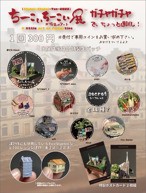 【告知】ちーこいちーこい展2022#指先のアート いよいよ明日11月2日11:00〜(^o^)/ 会場は、阪急千里線「関大前駅」北へ スキップで3分『Atelier Little』です! ”特製缶バッチ”や”ポストカード””1/700 Fire starter レジン製建物”が当たるガチャガチャもあるよw 入場、観覧無料!お待ちしてます!