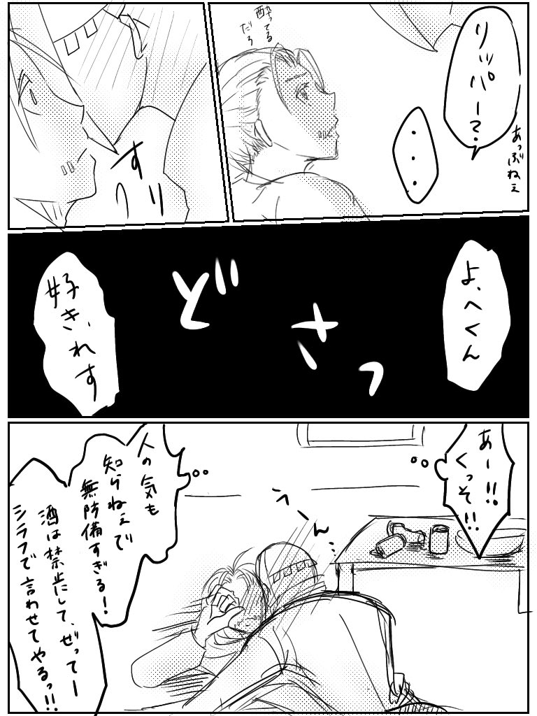 遅刻ですが参加させて頂きます。 お題は「お酒は禁止!」でお借りしました。傭→←リで付き合ってないです。 #傭リお絵描き60分一本勝負