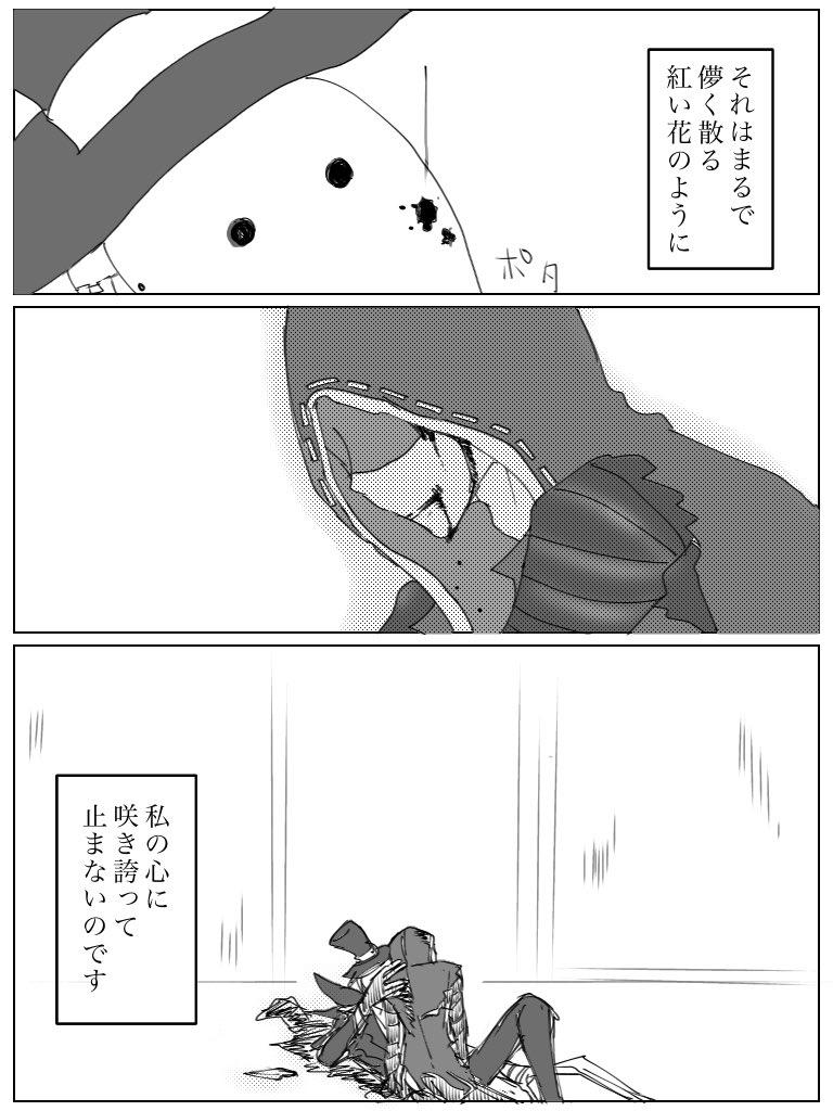 5 23 お題「それは儚く散る紅い花のように」をお借りしました。シリアスは耐え切れずオマケも描きました。寝るまでが今日。 #傭リお絵描き1週間一本勝負 21/12/06 03:21