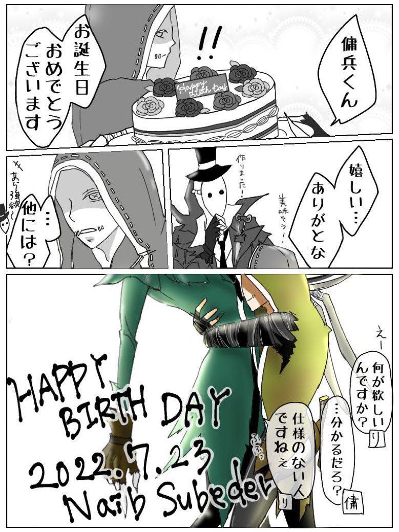 22 79 お題「誕生日」お借りしました。傭リ。突然思い立って描いたので素直に祝っていちゃついてるだけ!間に合って良かった…。 お誕生日おめでとう。 #傭リお絵描き1週間一本勝負 22/07/23 21:43